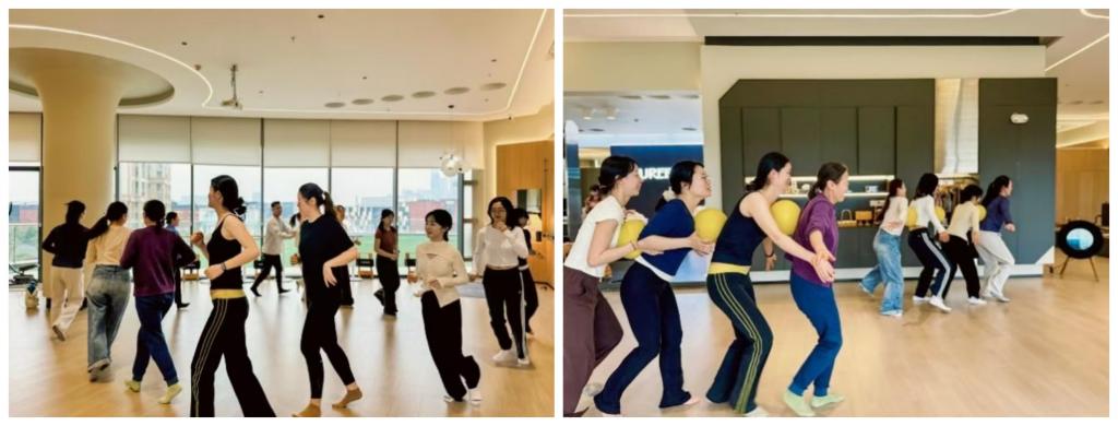 活动开始,在优体普拉提创始人Quinnie老师的带领下,大家体验了一小时的婵柔训练。婵柔始于二十世纪八十年代,融合瑜珈、太极、体操以及舞蹈的动作特色,强调脊椎在三维平面的运动,并由脊椎连接到四肢,是一套独特的脊柱螺旋运动方法。老师们从繁忙的讲台和伏案中脱离出来,拉伸肌肉,放松筋膜,享受了一段身体舒展的轻松时光。