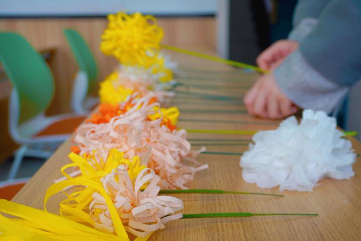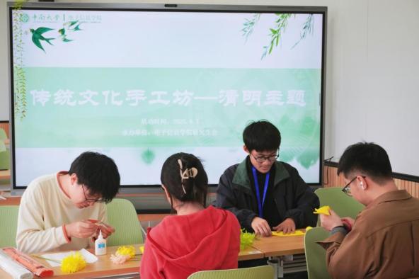 4月3日下午,一场以清明为主题的传统文化手工坊在电子楼智慧教室温馨开展。活动分为“柳枝绕环”和“折纸成花”两个环节,同学们以仿真柳枝与花艺胶带编织柳环,以褶皱软纸折出象征思念的菊花,指尖流转间赋予了传统习俗以新的表达。